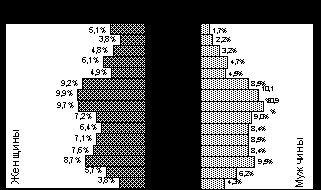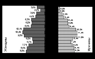 Итогом подобного сокращения детского населения и соответственно роста удельного веса лиц старших возрастных групп явилась резко выраженная регрессивная половозрастная пирамида населения области к 1998 году.