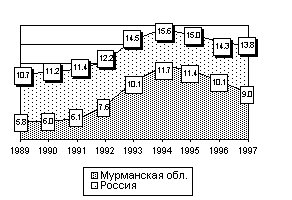 Средний ежегодный темп снижения численности населения Мурманской области за период с 1989 года увеличился более чем в 3 раза и составил в 1998 году -1,5%.