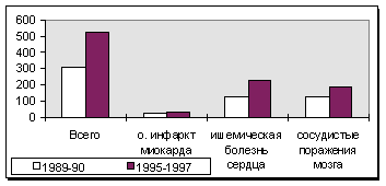 В динамике за последние 3 года смертность от данного класса причин снизилась на 20 %, в основном за счет снижения смертности от ИБС (на 35 %), смертность от инфаркта миокарда и сосудистых поражений мозга значимо не изменилась. В сравнении с 1989-1990 гг. смертность от ишемической болезни сердца увеличилась на 75 %, от сосудистых поражений мозга - на 45 %.