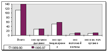 В динамике с 1995 по 1997 г.г. не отмечается значимого снижения смертности по этому классу причин. По сравнению с 1989 - 90 гг. смертность от злокачественных новообразований увеличилась на 22 %, в т.ч. от зно органов пищеварения на 17 %, зно молочной железы - на 68 %, зно женских половых органов - на 16 %.