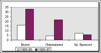 В динамике за последние 3 года смертность от от данной группы причин снизилась на 79 %, в том числе от пневмоний - на 83%, от хронического бронхита - на 51%. Однако, в сравнении с 1989-90 гг.. показатели смертности от болезней органов дыхания увеличились в 2 раза.. Смертность от пневмоний выросла в 5 раз. В динамике смертности от хронического бронхита отмечается тенденция снижения, за анализируемый период смертность снизилась на 30%.