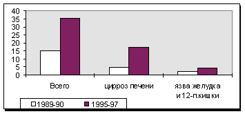 Динамика смертности с 1995 г показывает снижение показателей по группе болезней пищеварения на 39 %. В сравнении с 1989-90 гг. показатели выше в 2,5 раза. Смертность от цирроза печени увеличилась в 3,7 раза, от язвы желудка и 12-перстной кишки на 87 %.