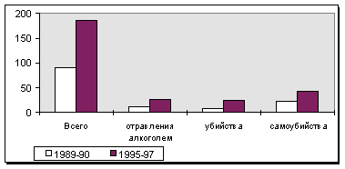 В сравнении с 1989-90 гг. смертность от данного класса причин в 1995-97 гг. выросла в 2 раза, в том числе от отравлений алкоголем в 2,3 раза, от убийств - в 3,2 раза, от самоубийств - на 90%.