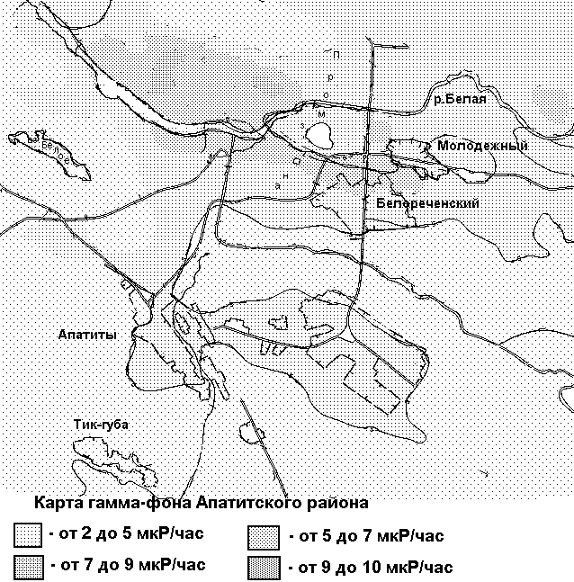 На большей части территории района гамма-фон довольно низкий, от 2 до 7 мкР/час. Особенно низкий фон в долине реки Жемчужная и в районе озера Белое. Повышенные значения мощности дозы гамма излучения отмечаются в долине реки Белая, которые совпадают с песчаными отложениями (отходами) от переработки апатит - нефелиновых руд АНОФ-2. Содержание урана и тория в почве этого участка выше среднеевропейских значений.