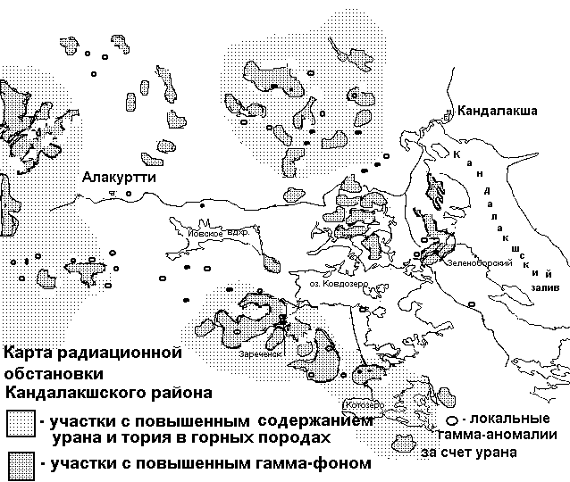 Гамма-фон в черте жилой зоны города Кандалакши характеризуется низкими значениями и варьируется в пределах от 4 до 14 мкР/час. Участки с повышенным гамма-фоном имеют техногенное происхождение и связаны с применением гранитной крошки: в гранитных плитах в качестве облицовочного материала, в огнеупорном кирпиче,в качестве материала-наполнителя асфальта. Выявлена зона повышенной концентрации цезия-137, приуроченная к долине р.Нива. Вызвана аномалия, вероятнее всего, смывом в придолинную часть следов "деятельности" Кольской АЭС. Не исключается возможность загрязнения территории в верховьях р.Нивы чернобыльскими осадками.