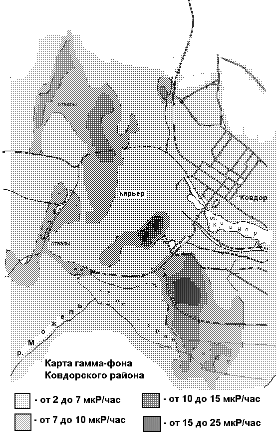 Источниками повышенного гамма-фона на территории района являются бедные уран-ториевые руды Ковдорского месторождения, которые при его разработке идут в отвалы или используются для изготовления стройматериалов, и высокорадиоактивные отходы переработки комплексных руд на комбинате