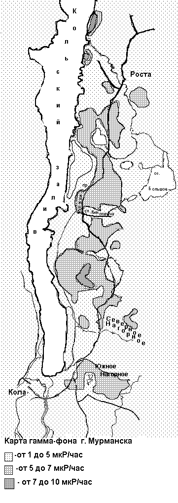 Радиационный гамма-фон в городе Мурманске и в его окрестности, в основном, определяется естественными радиоактивными веществами (уран, торий, калий), содержащимися в почве и в материалах, использованных при строительстве города. На фоне низких значений выделяются участки с повышенными значениями мощности дозы sгамма-излучения: на южном склоне горы Горелой и в районах озер Большое, Семеновское.