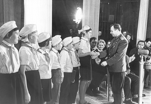 Пионеры приветствуют Ю.А. Гагарина в ДК им. С.М. Кирова. Декабрь 1965 г. / Pioneers are greeting Y.A. Gagarin. 1965