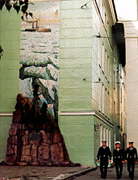 | Памятник ледоколу Ермак с торца Мурманского областного краеведческого музея |